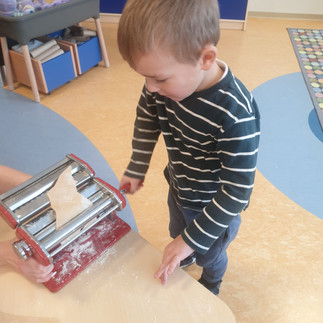 Tutvusime nädala teemaga ning rääkisime erinevate riikide rahvustoitudest. Alustasime muidugi kodumaistest toitudest ja lapsed nimetasid erinevaid Eesti rahvustoite, näiteks mulgipuder, verivorst, ühepajatoit. Rääkisime korraks ka lemmiktoitudest ning kohe kõlas ka „makaronid“. Uurisime, kust need laste lemmikud makaronikesed pärit on ja mõned lapsed teadsid, et muidugi Itaaliast. Vaatasime õppevideot 103 aastasest itaallannast, kes oli juba 93 aastat ise pastat valmistanud ja kasutas seda tehes sama taignarulli. 10ne aastaselt õpetas vanaema teda seda tegema. Videos oli näha ka kuidas tädi kõigepealt pasta jaoks oma kanadelt mune korjas ja kuidas tema poeg veskist jahu käis toomas. Lapsed vaatasid põnevusega õppevideot ja ootasid, et saaks isegi käed külge lüüa. Et pisikud ei leviks, sõtkusid gruppidesse jagatud lapsed kilekottides taignapalle ja imestasid, kuidas 103aastane tädike seda küll nii mängleva kergusega oli teinud. Peale sõtkumist ja taignapallide „puhkamist“ jahedas hakkasime pastamasinaga pallikestest õhukesi plaate rullima ning neist hiljem tagliatelle kujuga makarone. Jätsime valmis pasta kuivama ning ärgates panime need keema. Kastmeks hautasime oliivõlis veidi küüslauku, segasime juurde tükeldatud tomatid ja maitsestasime soolaga. Vahtraninad sõid suure isuga ja leidsid, et nii makaronid kui ka lihtne tomatikaste maitsesid hästi!:)
